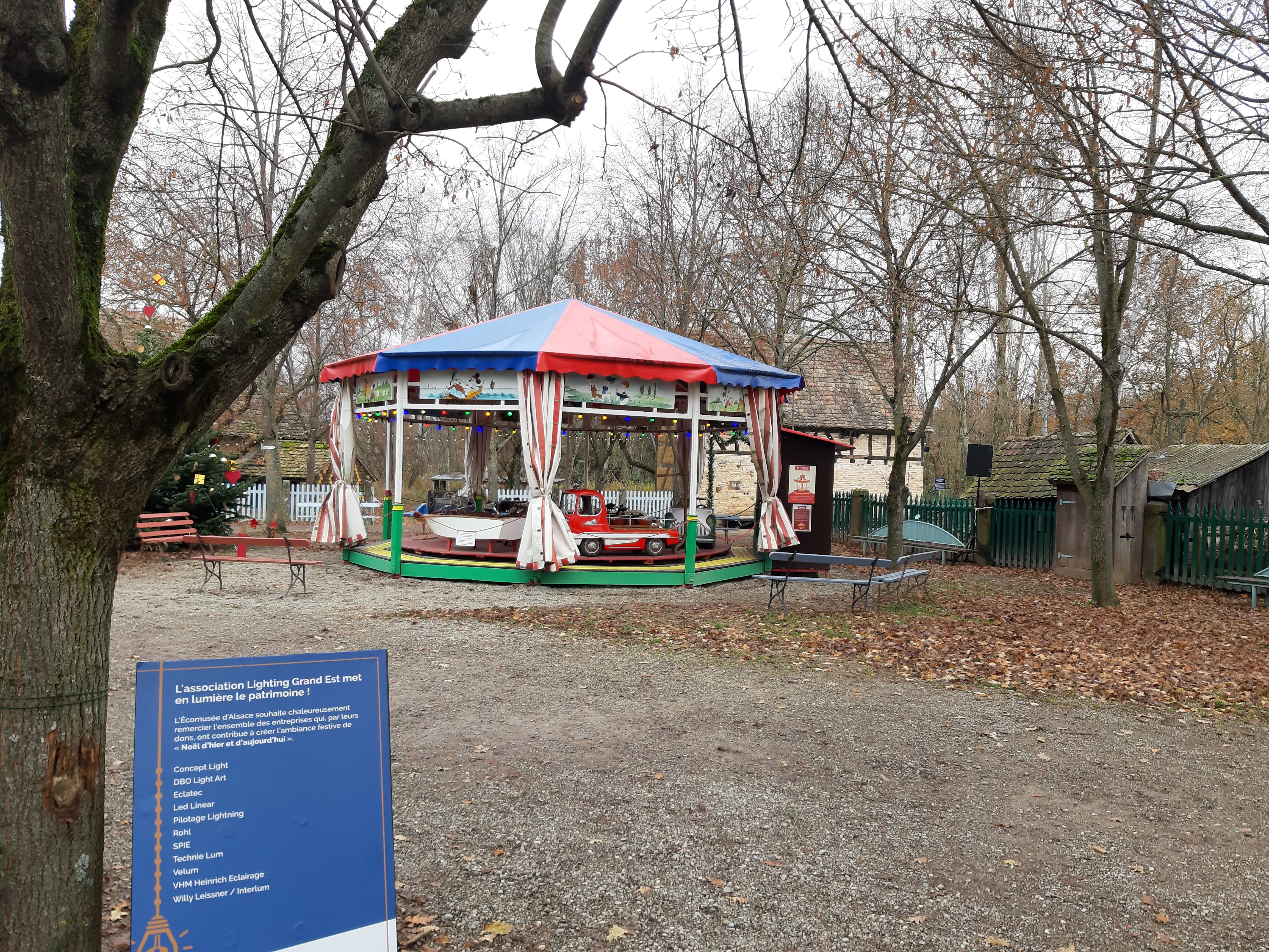 Pour son ouverture hivernale, nous avons visité l'écomusée en cette fin d'après-midi du 27 novembre. Le nouvel accès routier est enfin pratique (et digne de ce nom). A la caisse, un peu de queue, la vente des billets se conjugue avec l'information des visiteurs ; ce n'est pas très efficace. Le site est magnifiquement décoré pour les fêtes avec des éléments naturels. On en a plein les yeux. Si beaucoup d'artisans ne sont pas dans leur atelier, on trouve cependant de nombreuses femmes dans les cuisines, les stuwa des vieilles maisons. Elles sont vraiment jolies avec leur tenue ancienne. Comme il fait froid, on peut boire un verre chaud à l'intérieur ou à l'extérieur sur la place ou un peu plus loin. Vers 16h30 -17h quand la nuit tombe, les guirlandes illuminent le site. Il manque juste un peu de musique pour créer cet esprit de fête. Sur la place, une histoire est racontée en français et en alsacien (le dialecte au micro n'est pas agréable et peu de gens le comprennent). Le site est vraiment beau, magique à ce moment là. Il manque cependant des animations (pour les petits et les grands) pour être parfait...